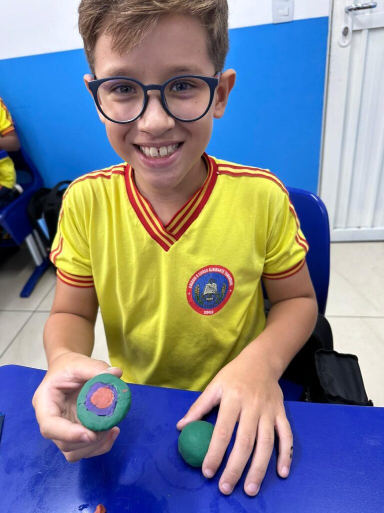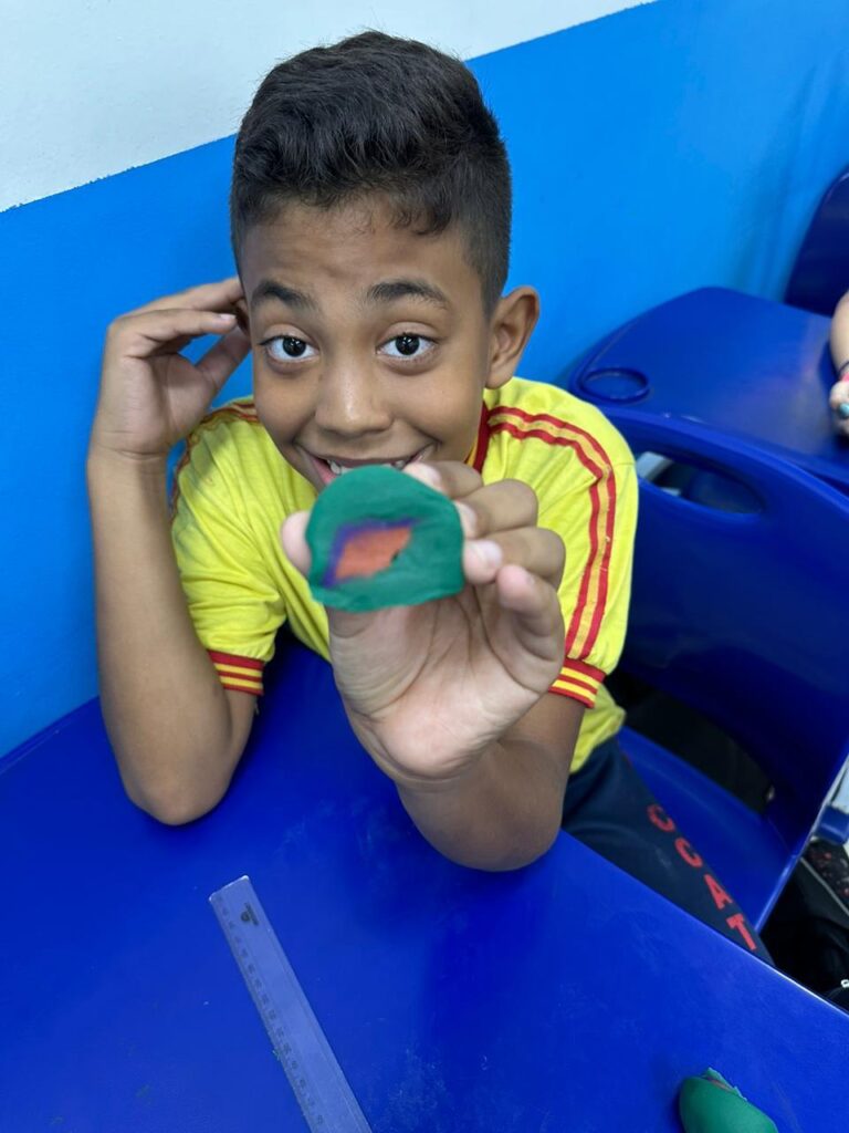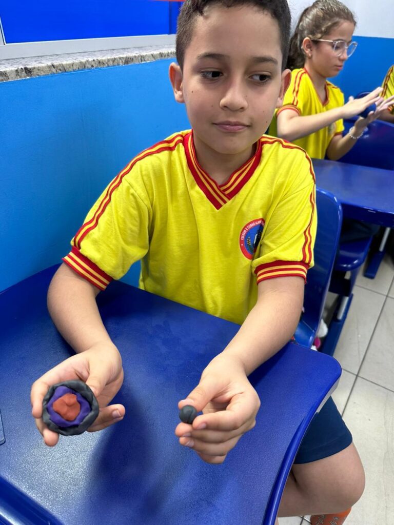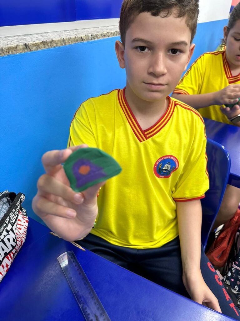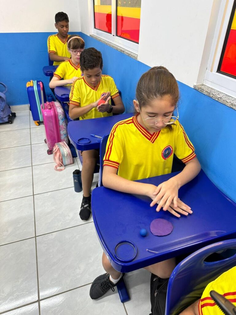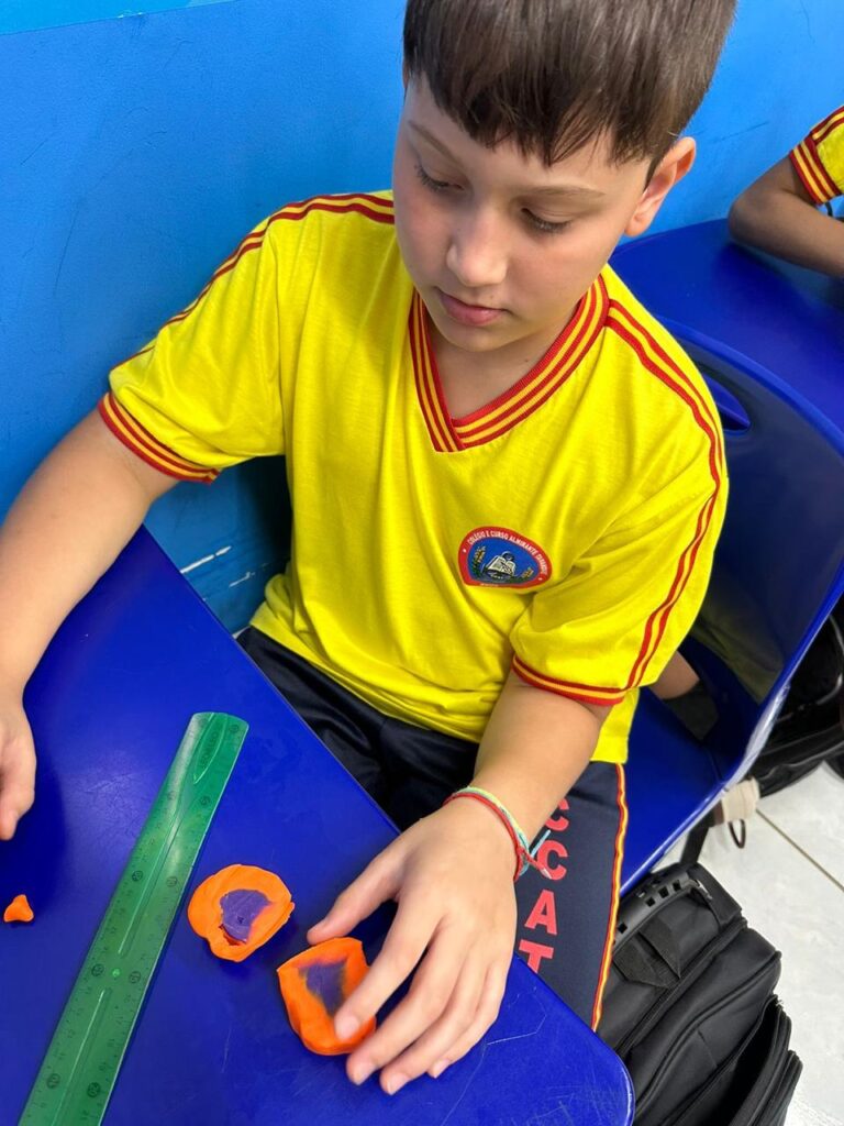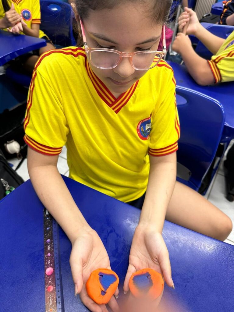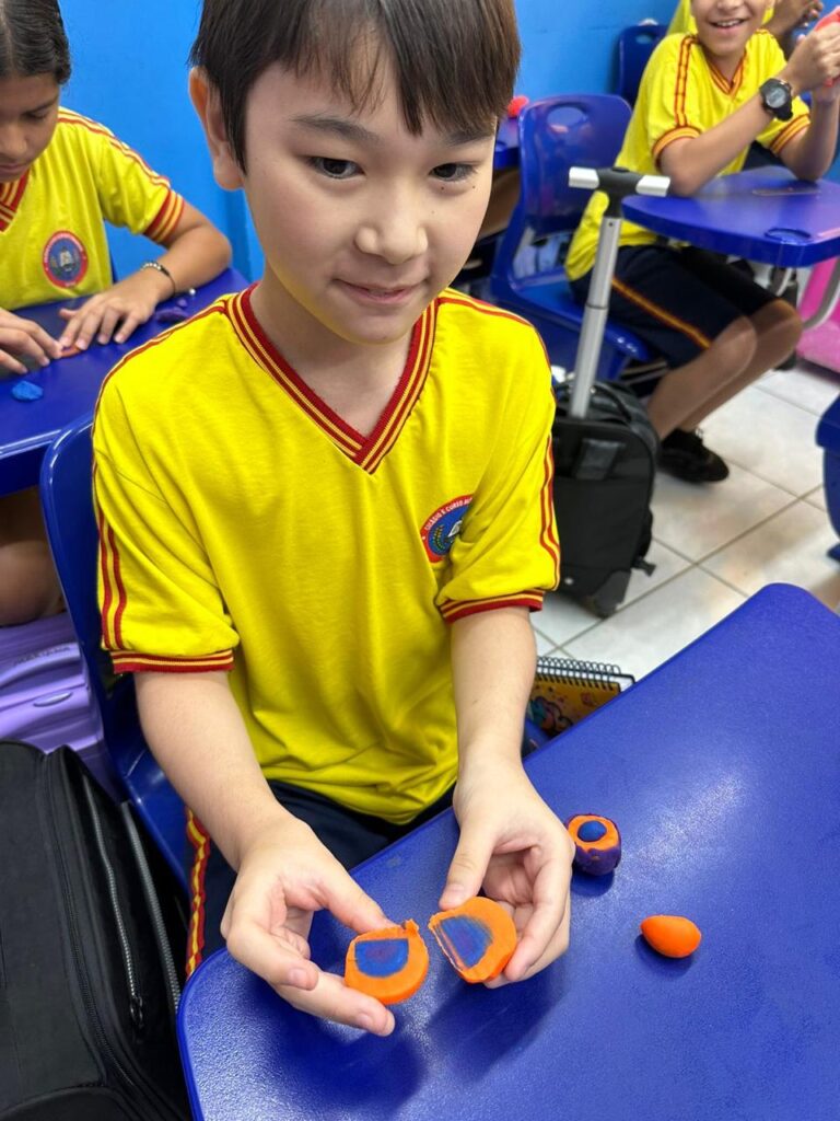Turminha dos 6º anos montando a estrutura interna do planeta Terra com massinha na aula de Ciências com a professora Yasminne!
