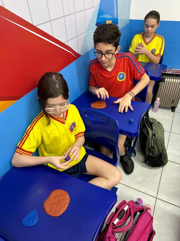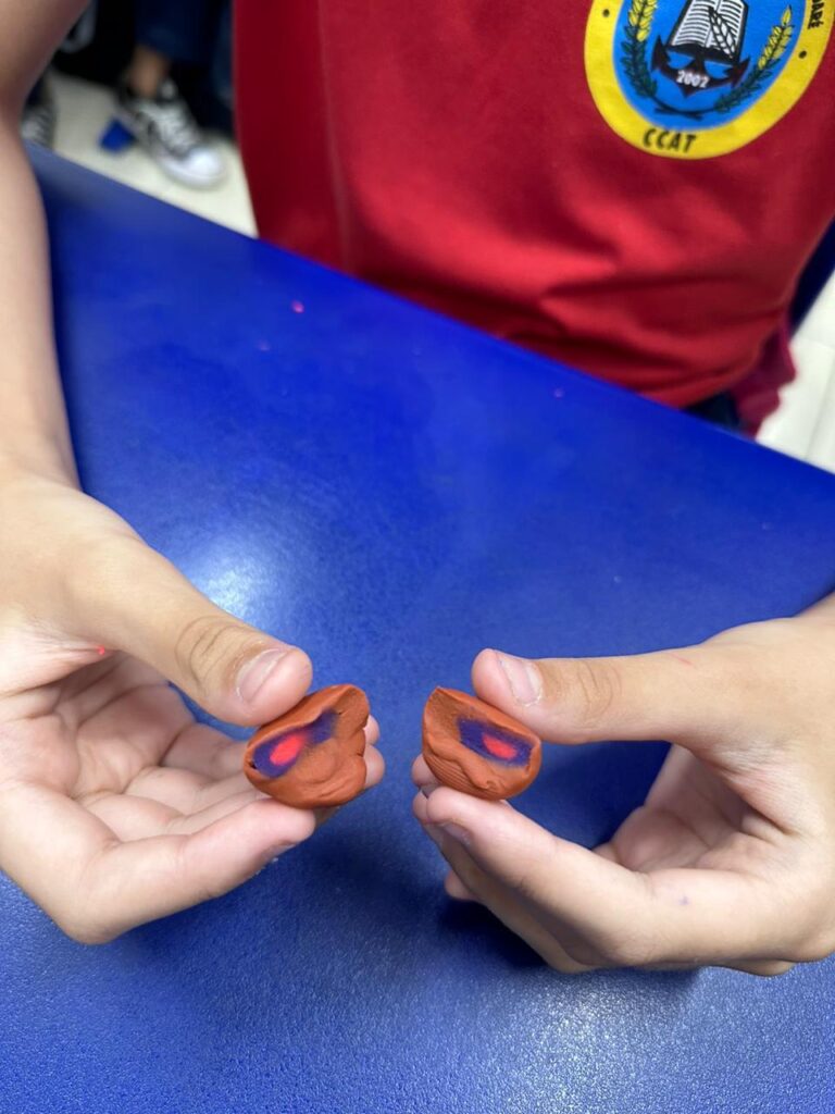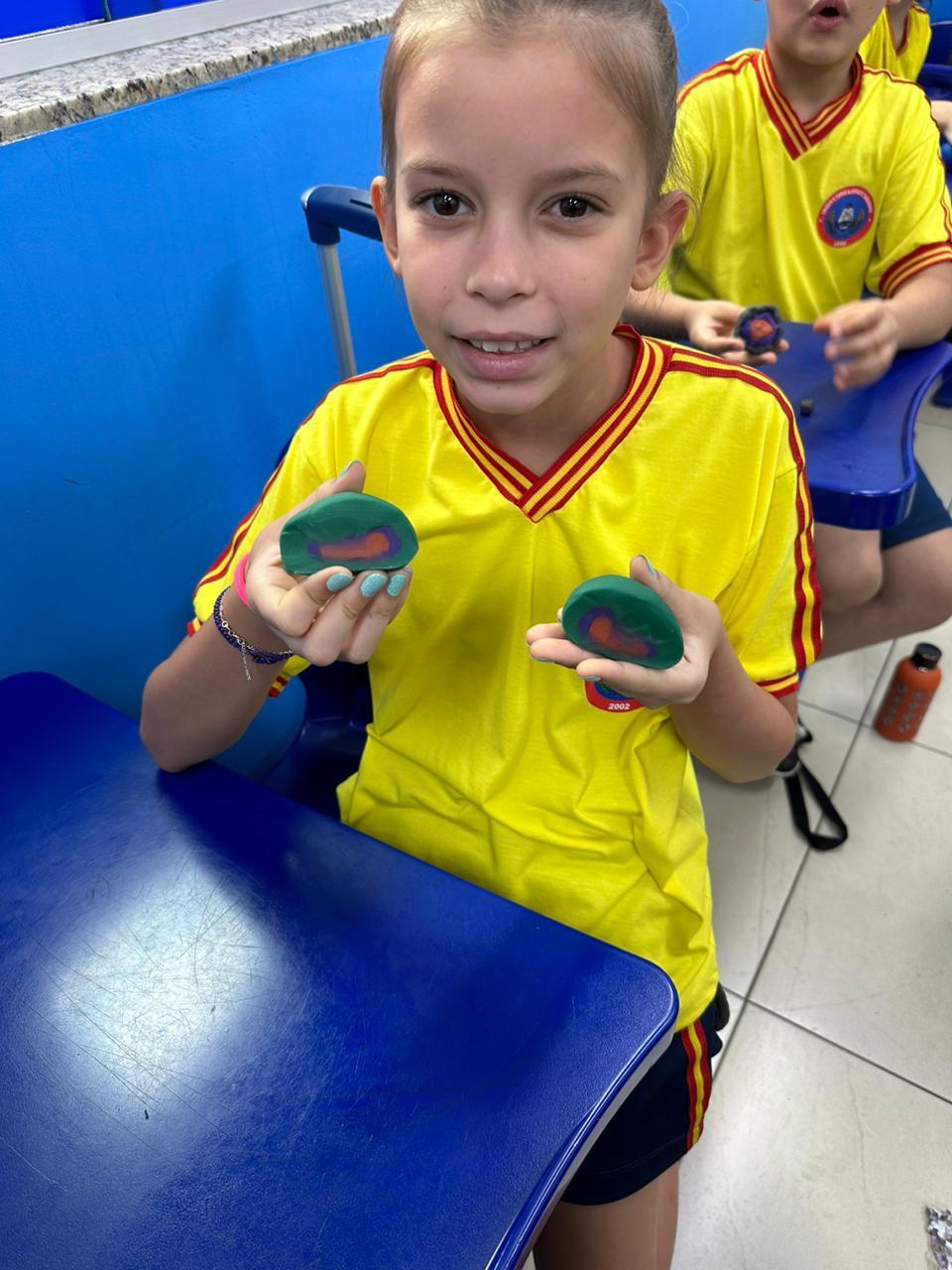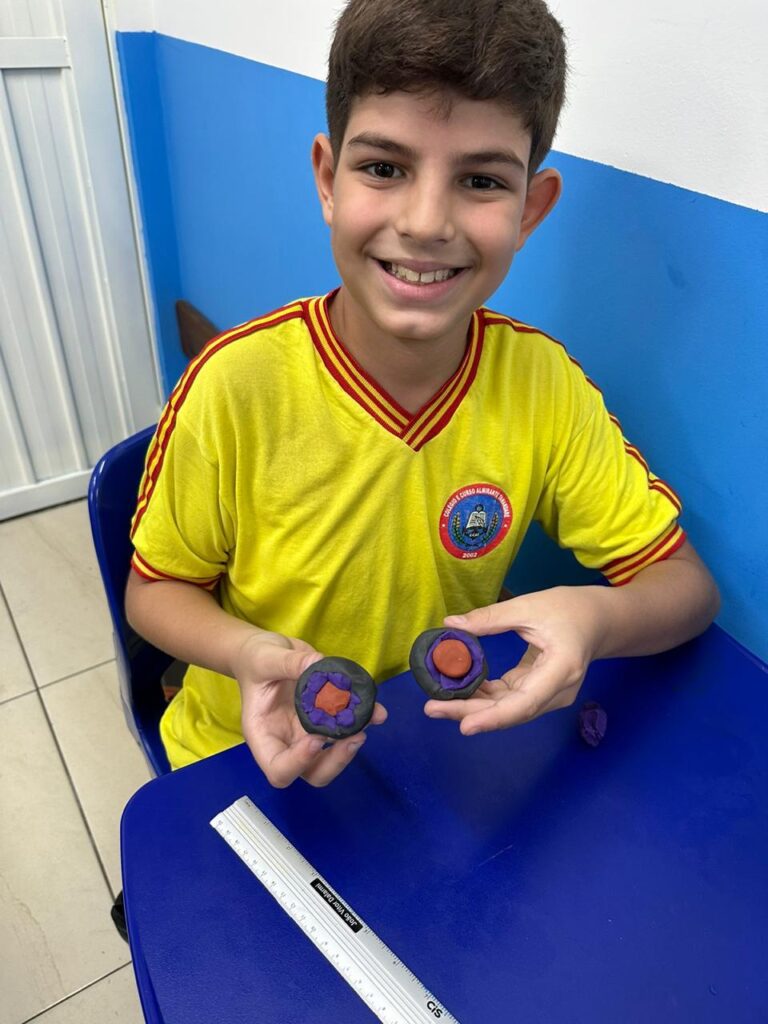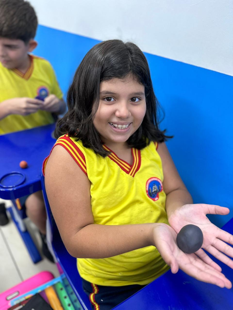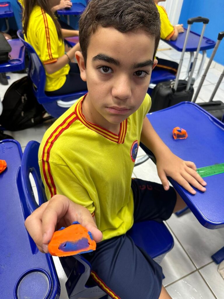 Turminha dos 6º anos montando a estrutura interna do planeta Terra com massinha na aula de Ciências com a professora Yasminne!