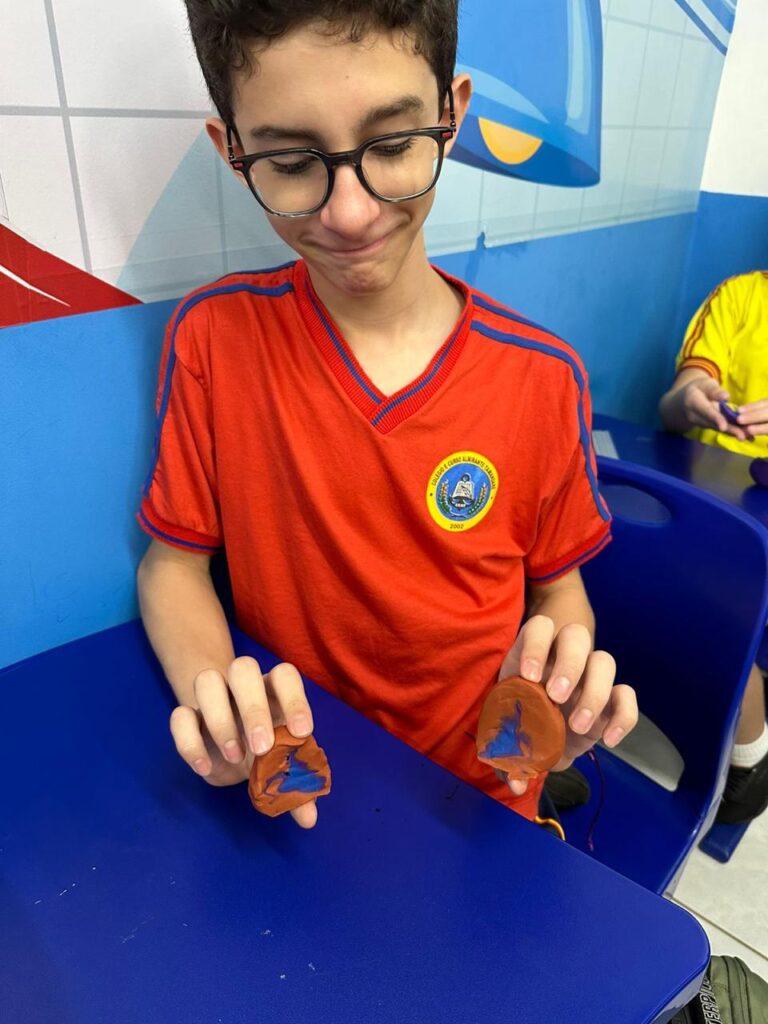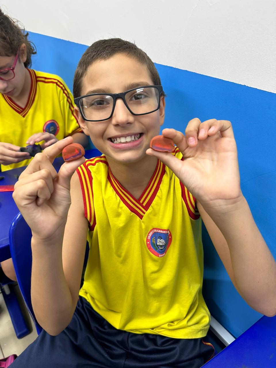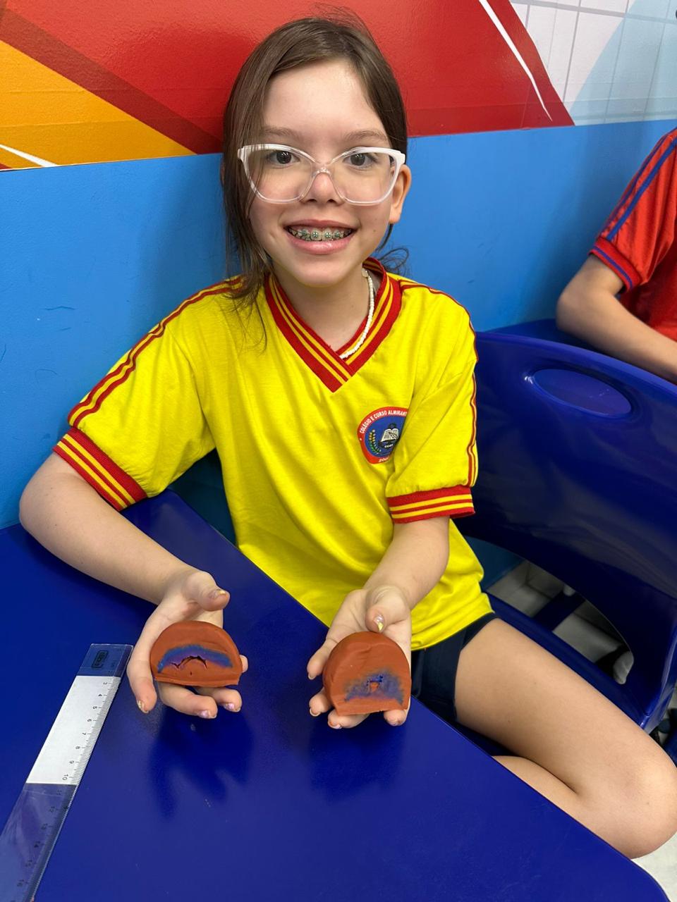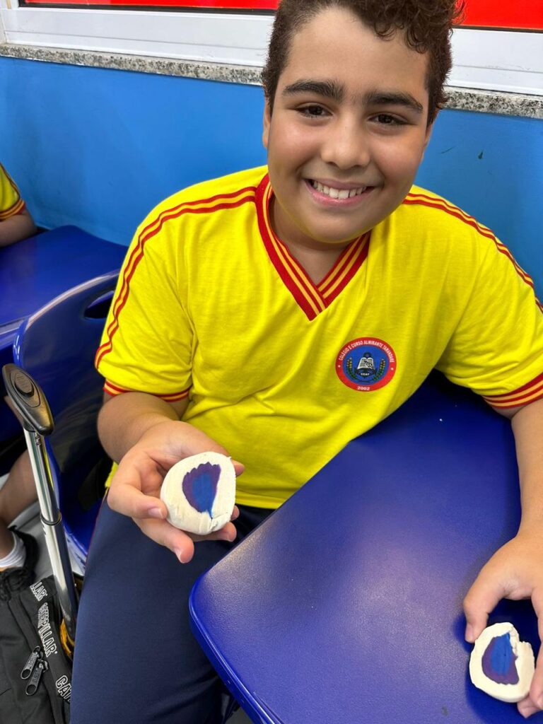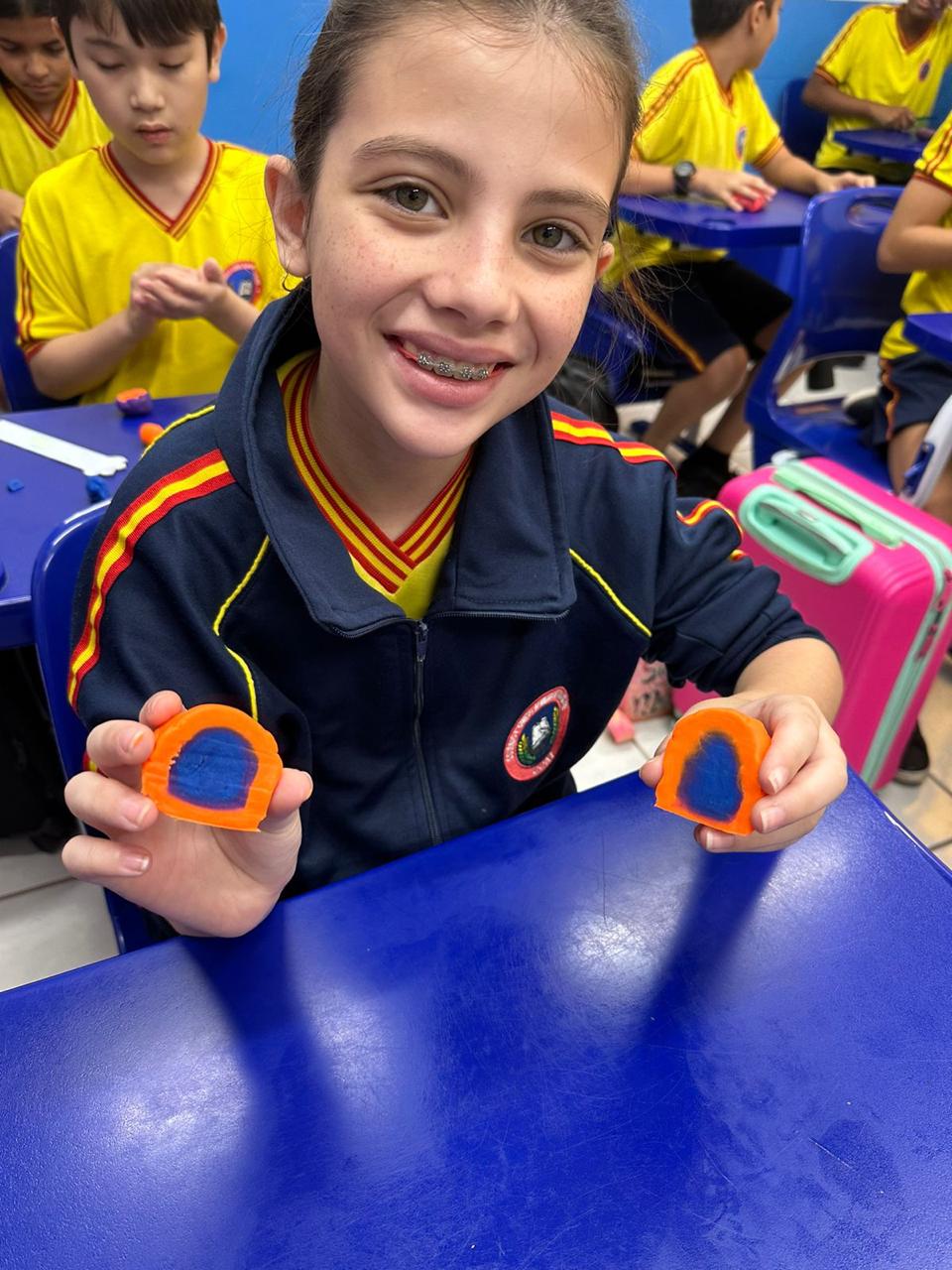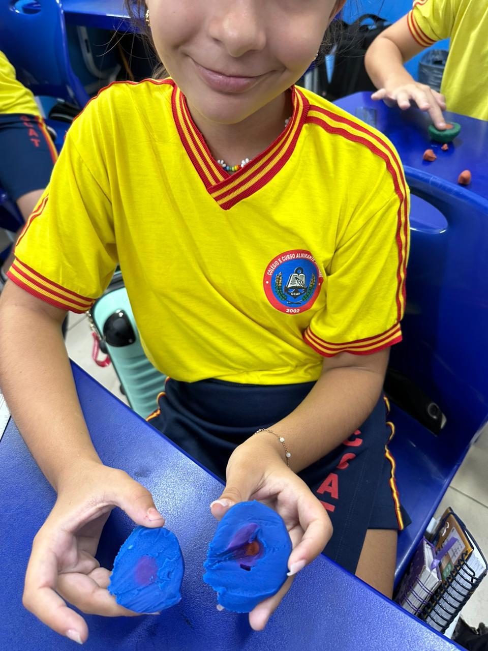 Turminha dos 6º anos montando a estrutura interna do planeta Terra com massinha na aula de Ciências com a professora Yasminne!