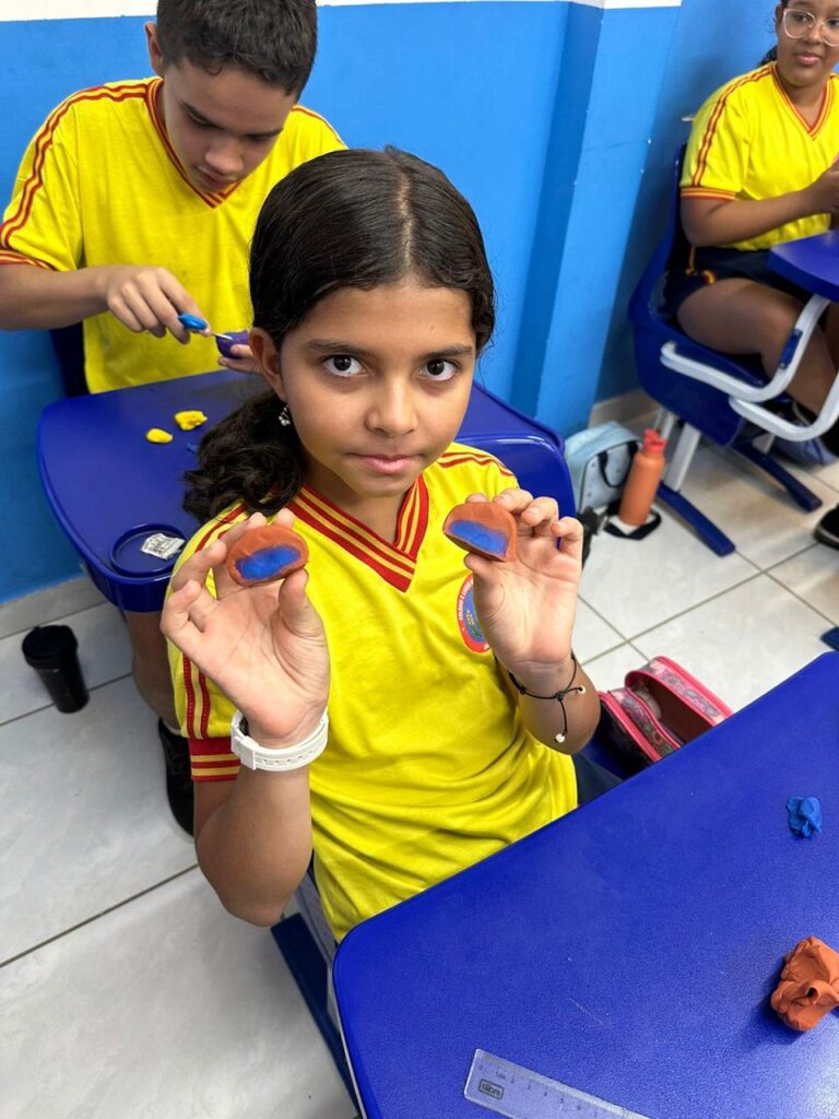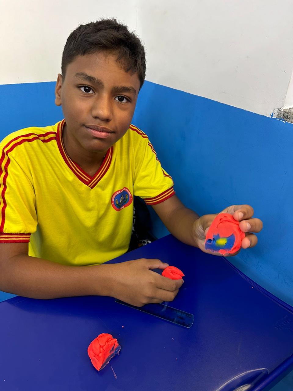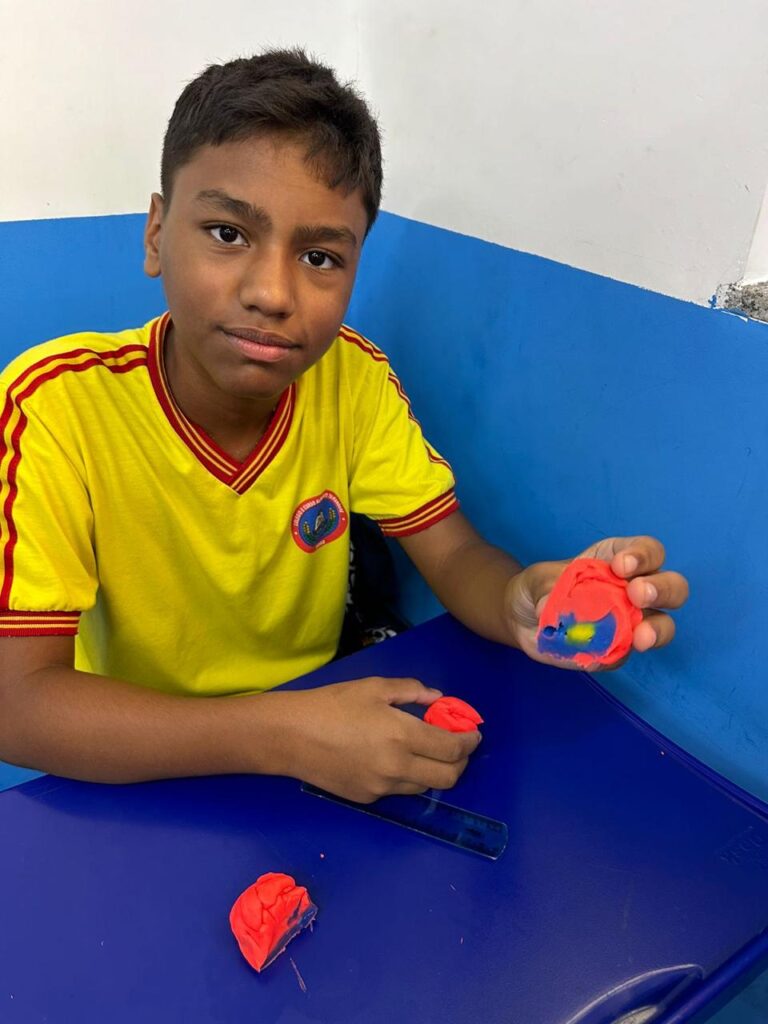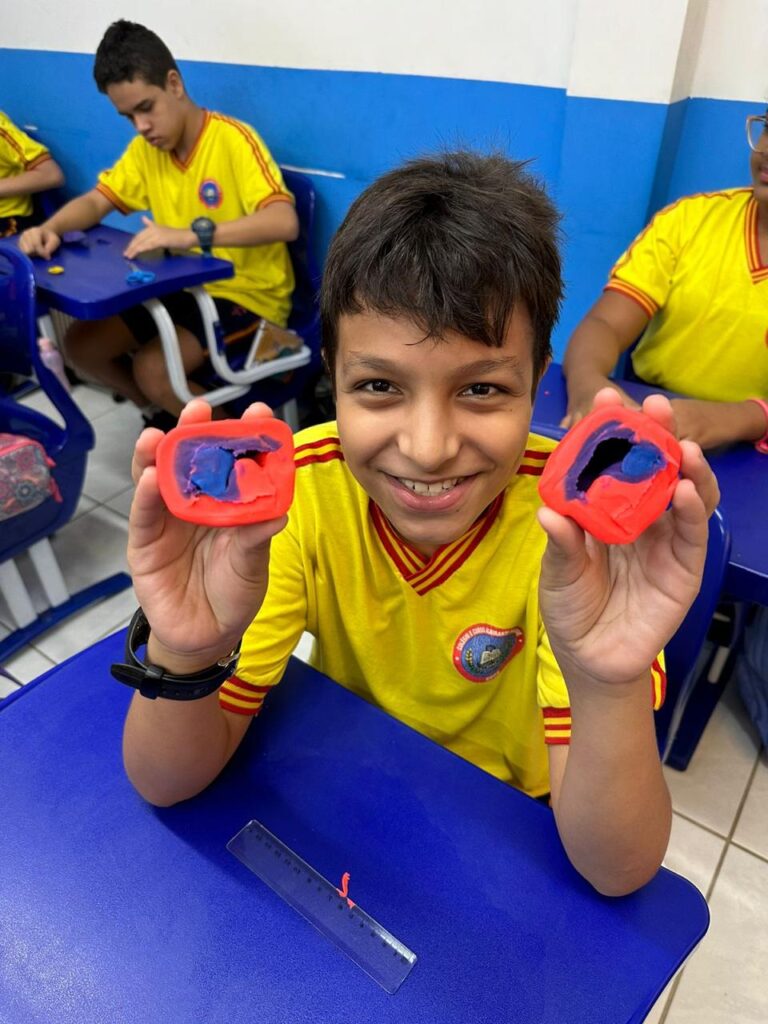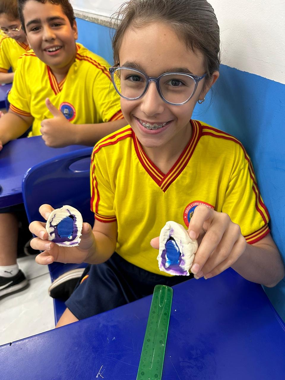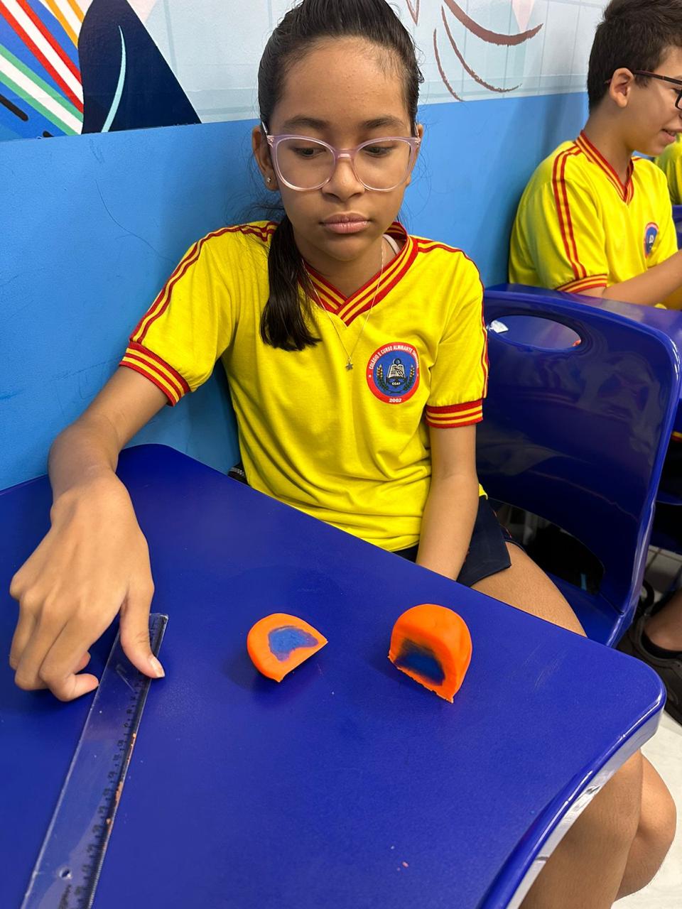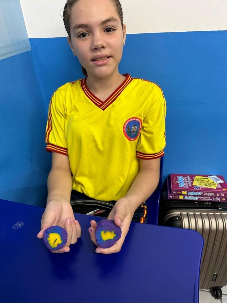 Turminha dos 6º anos montando a estrutura interna do planeta Terra com massinha na aula de Ciências com a professora Yasminne!